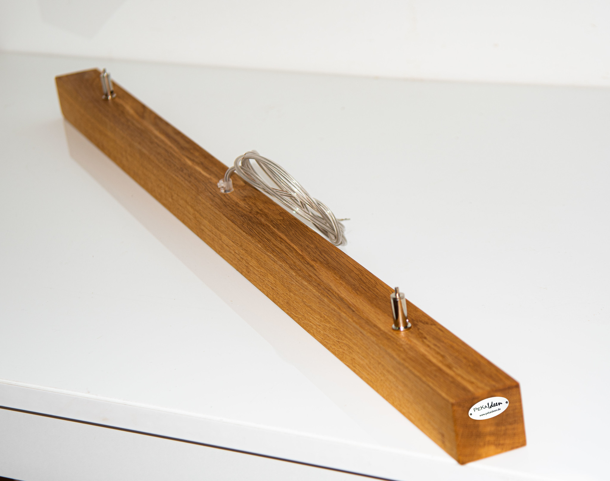 Schlicht, elegant, modern und zeitlos ist diese,aus einem massiven und geleimten Vierkantholz gefertigte Pendelleuchte. Mit den 2 hauchdünnen Drahtseilabhängungen scheint die Leuchte förmlich im Raum zu schweben, die Zuleitung wird mittig herausgeführt. Das nickel-matt gebürstete Trafogehäuse schließt die Leuchte zur Decke hin ab.