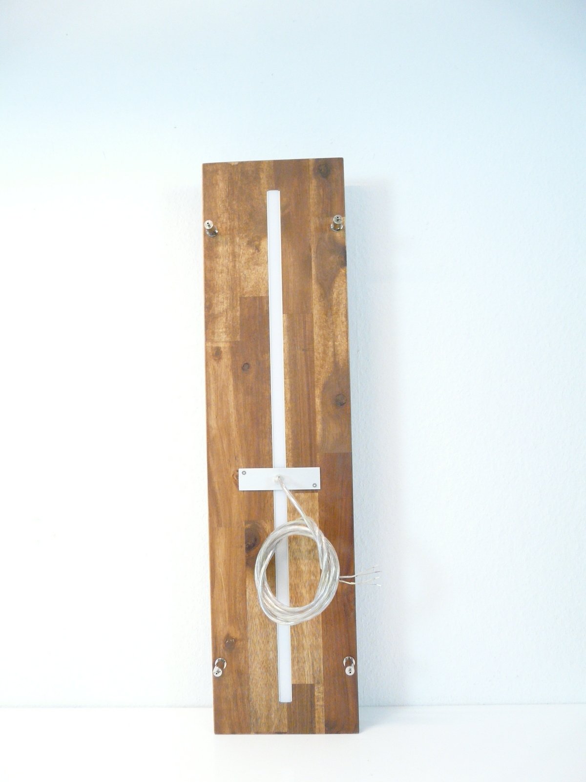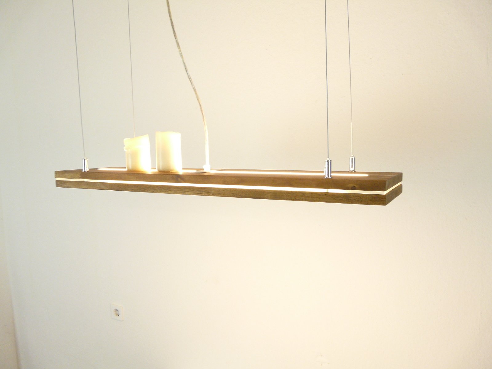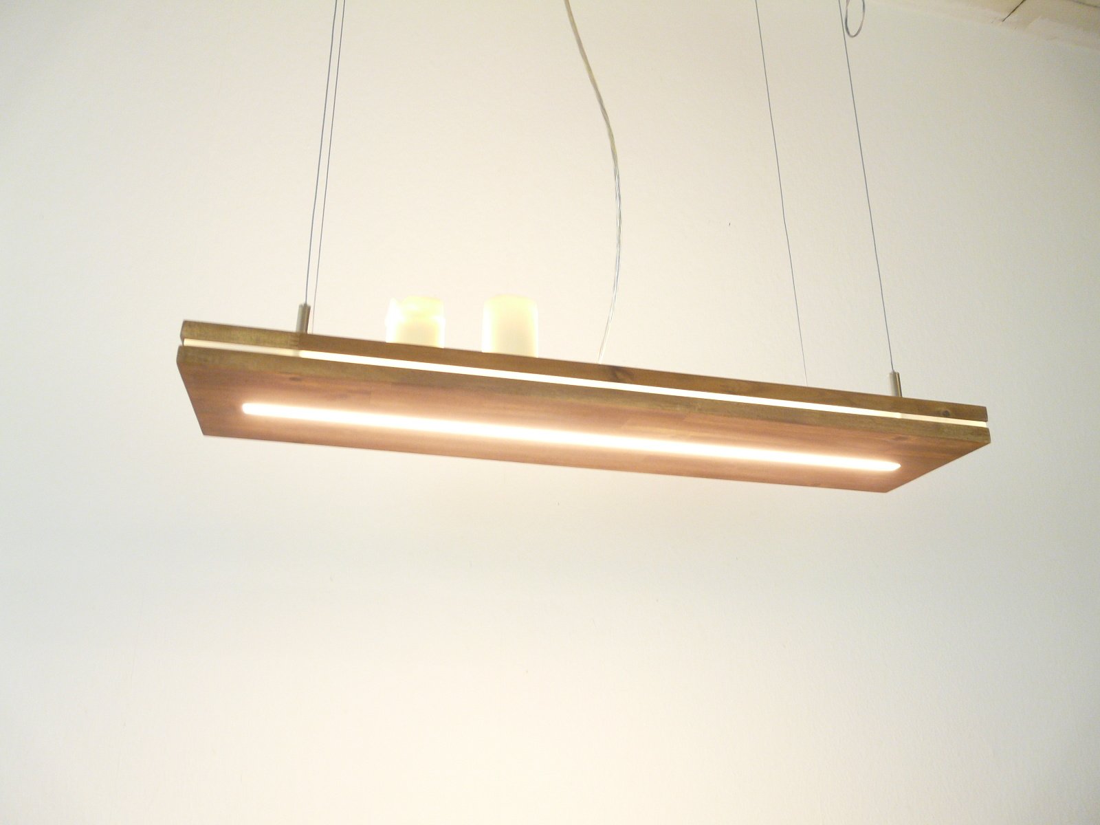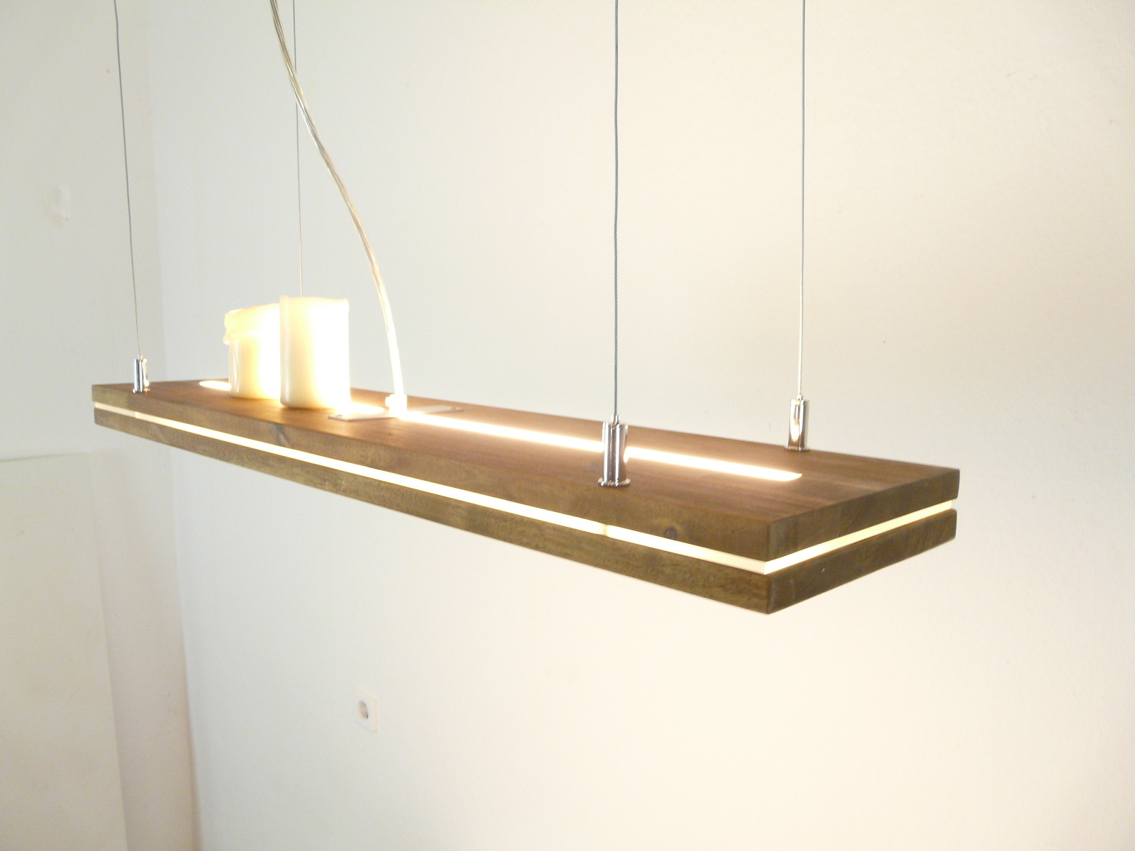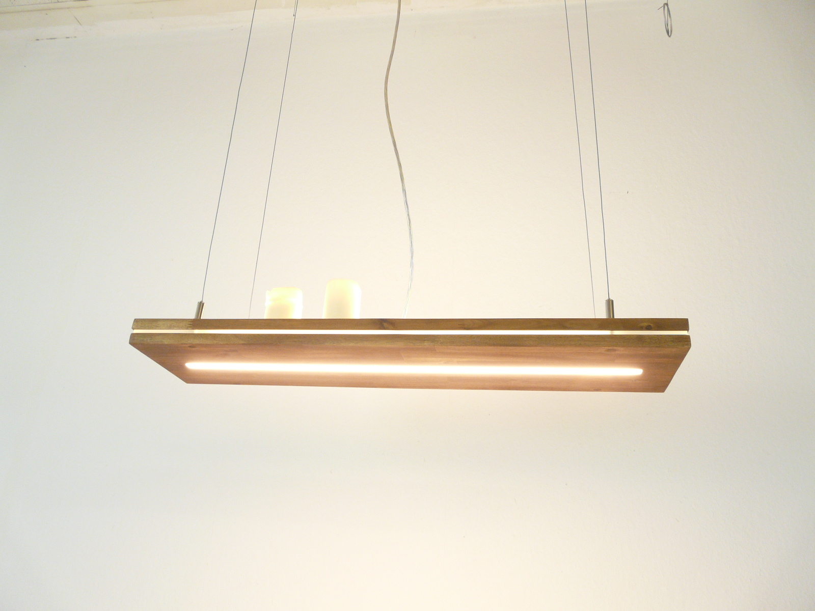 Ganz neu ist diese innovative Leuchte, "Sandwich" deshalb, weil zwischen den beiden Buchenholzplatten ein 5 mm starker Acrylstreifen eingearbeitet ist.Dieser Streifen wird durch LEDs separat, dekorativ und leicht dezent, beleuchtet. Durch die 4 hauchdünnen Drahtseilabhängungen scheint die Leuchte förmlich im Raum zu schweben.