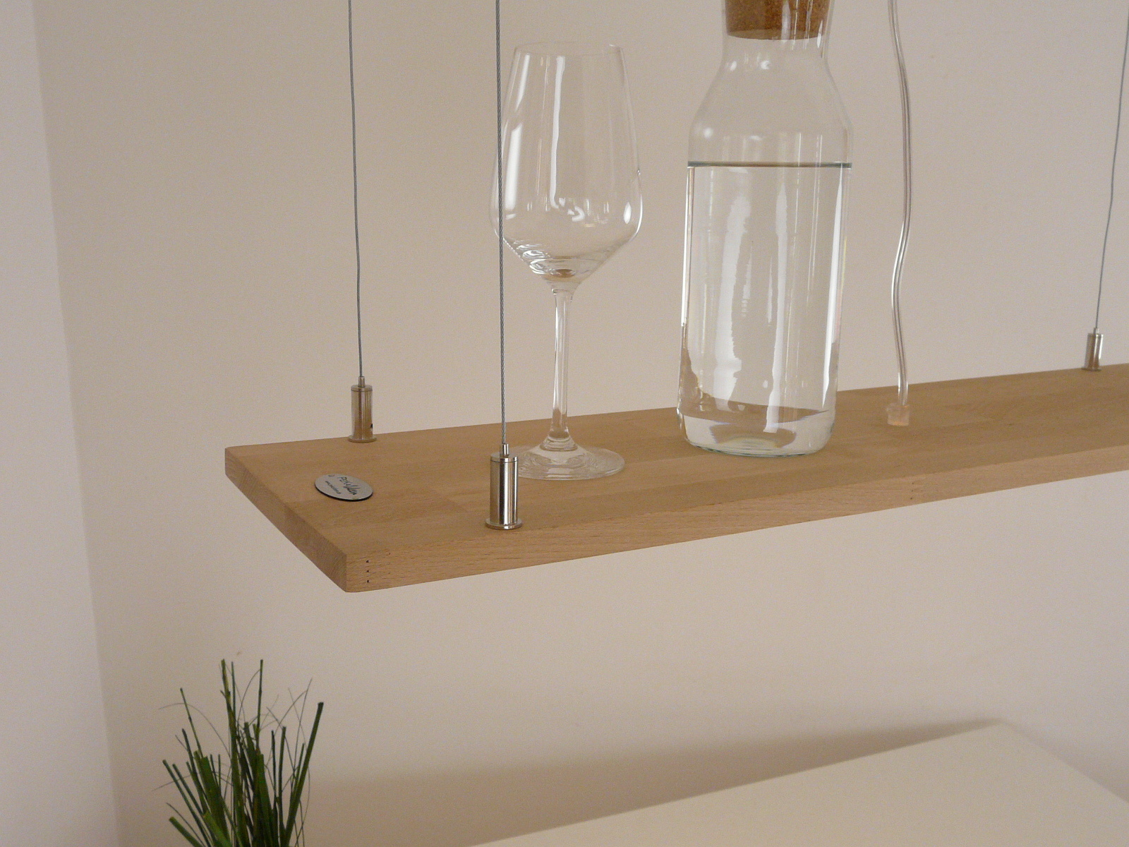 Durch die 4 hauchdünnen Drahtseilabhängungen scheint die Leuchte förmlich im Raum zu schweben.