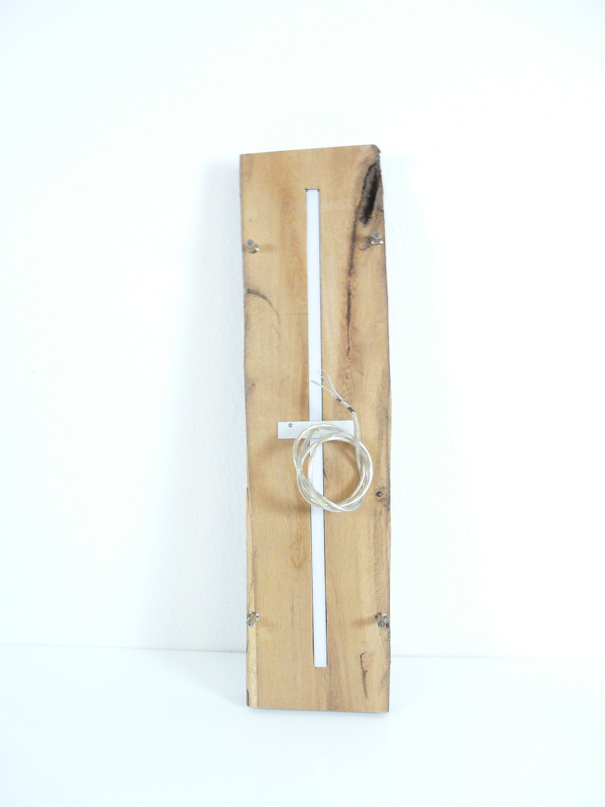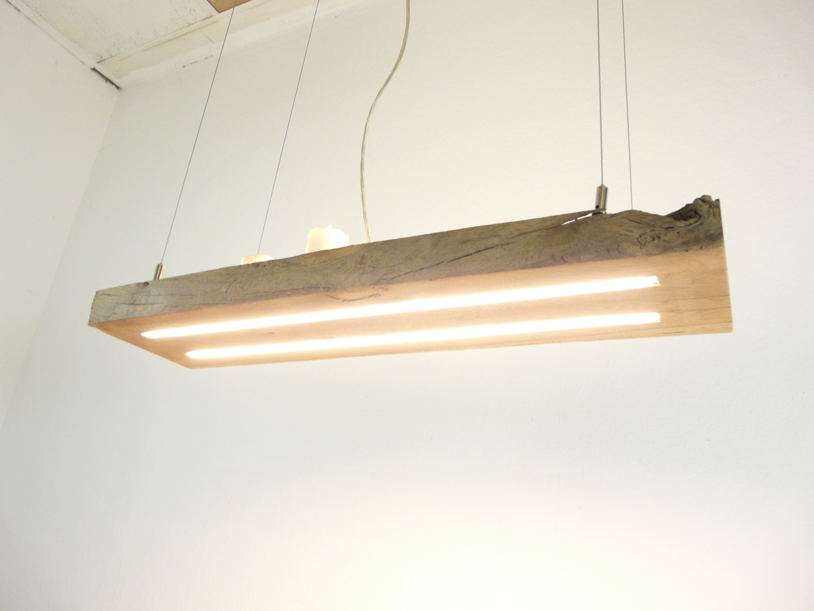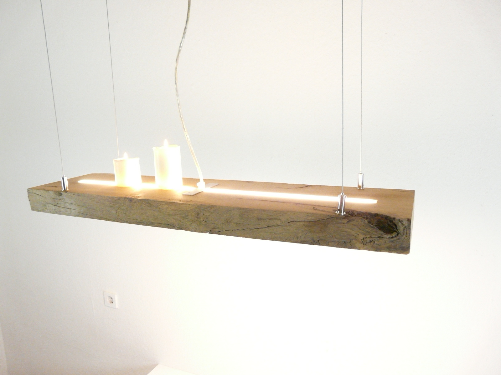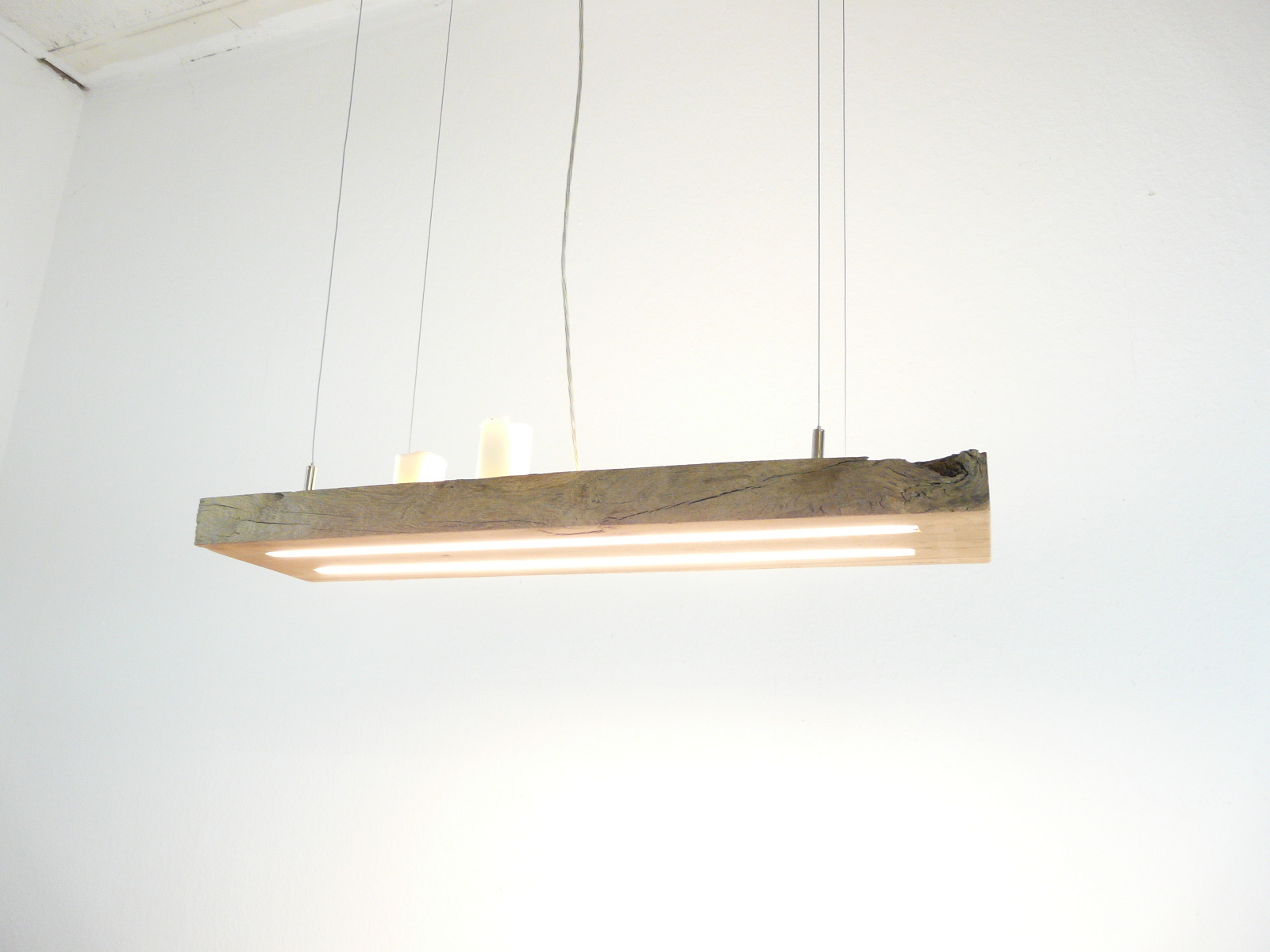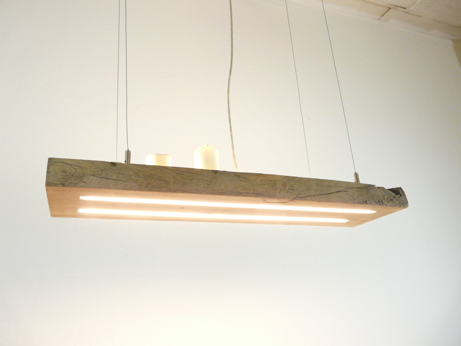 Ein mehrere hundert Jahre alter Holzbalken wurde zu einer wunderschönen Lampe in Handarbeit gefertigt.