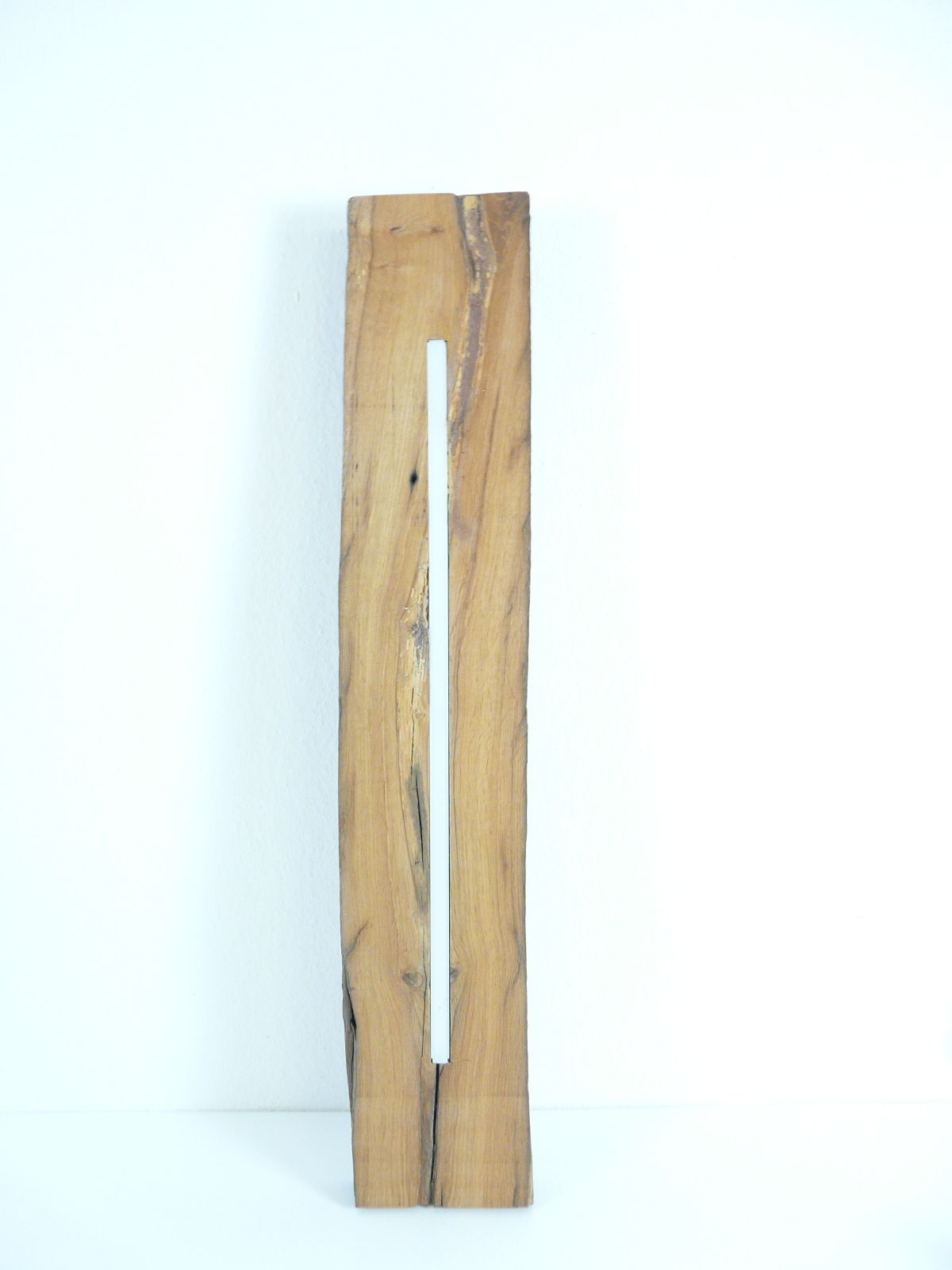 Die Holzoberfläche des Eichenbalkens wurde naturbelassen und dadurch zeigt sich gerade die antike Maserung des Eichenholzes. Durch die hauchdünnen Drahtseilabhängungen scheint die Leuchte förmlich im Raum zu schweben.