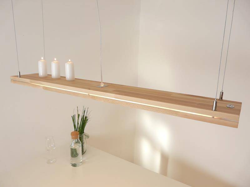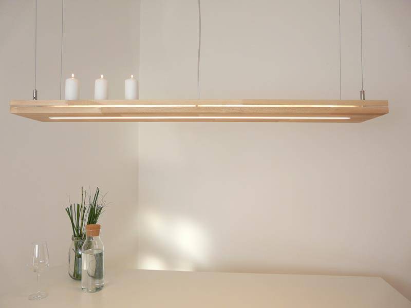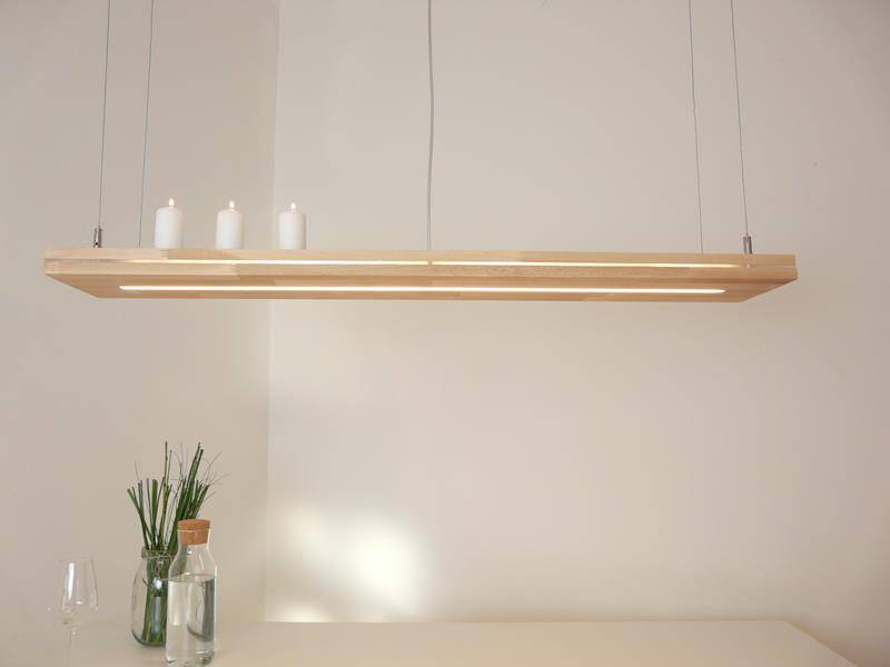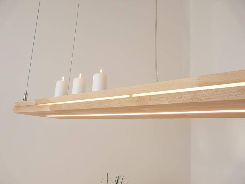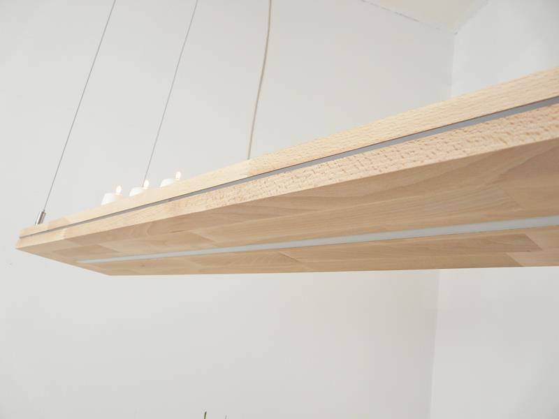 Ganz neu ist diese innovative Leuchte, "Sandwich" deshalb, weil zwischen den beiden Buchenholzplatten ein 5 mm starker Acrylstreifen eingearbeitet wurde.Dieser Streifen wird durch LEDs separat, dekorativ und leicht dezent, beleuchtet. Durch die 4 hauchdünnen Drahtseilabhängungen scheint die Leuchte förmlich im Raum zu schweben.