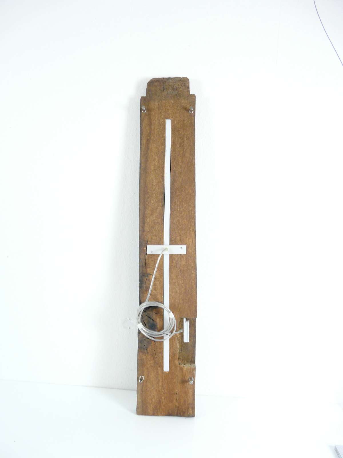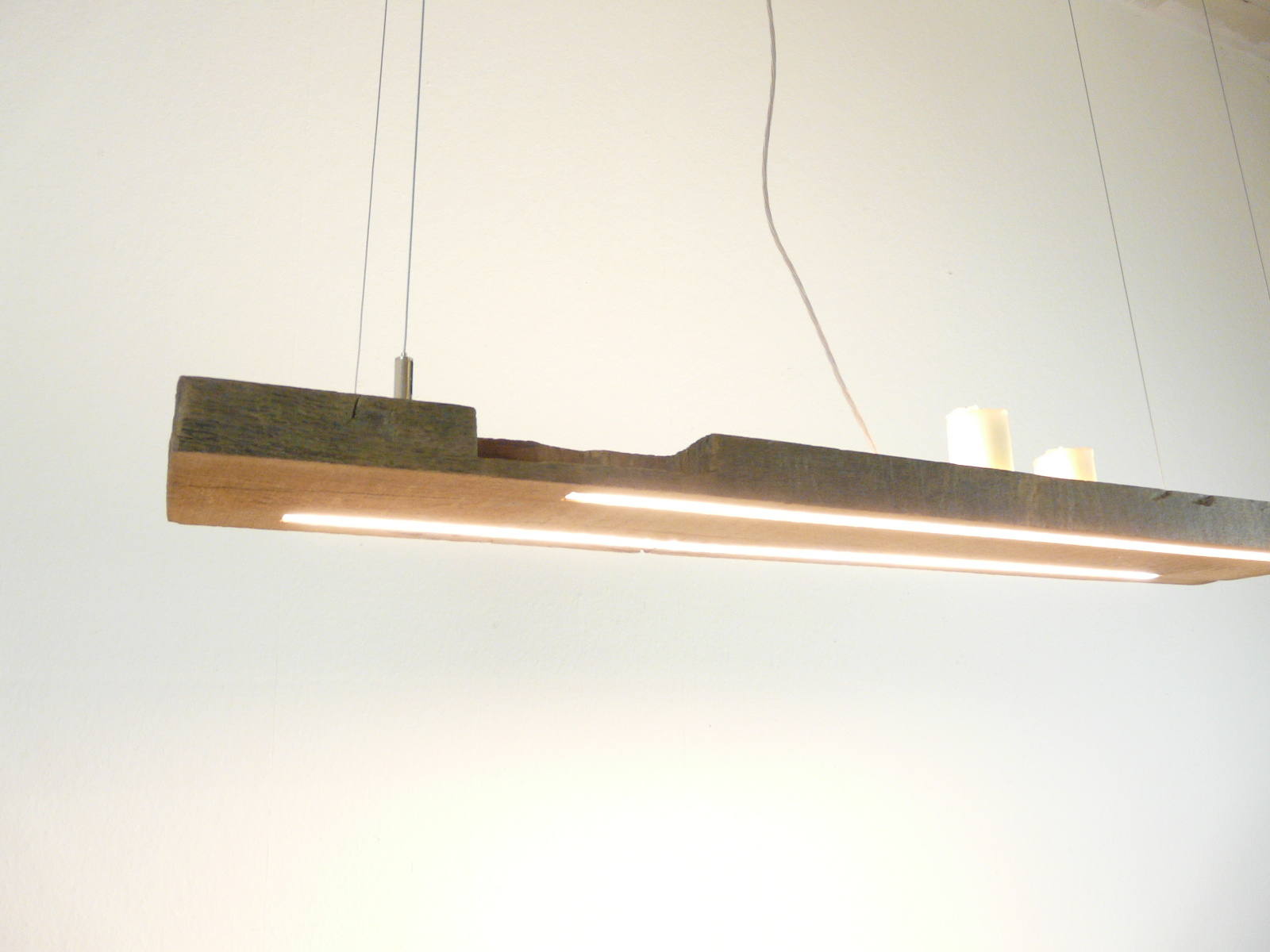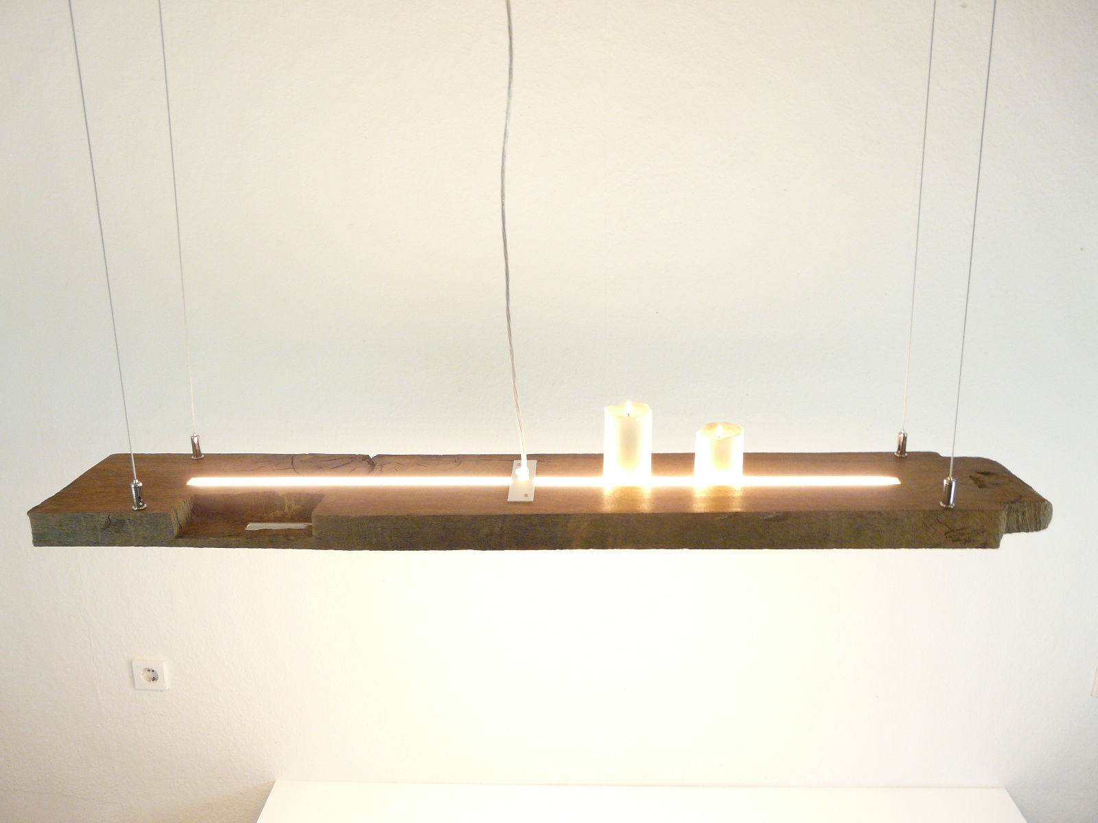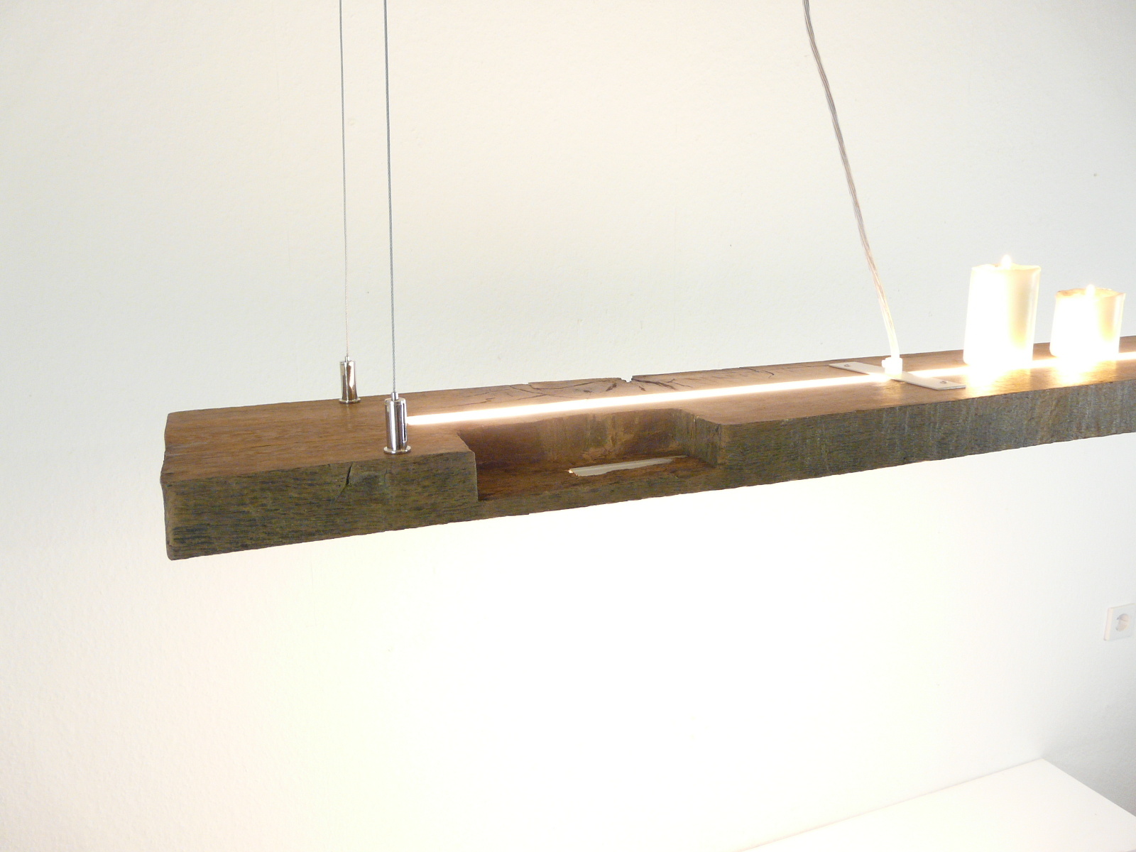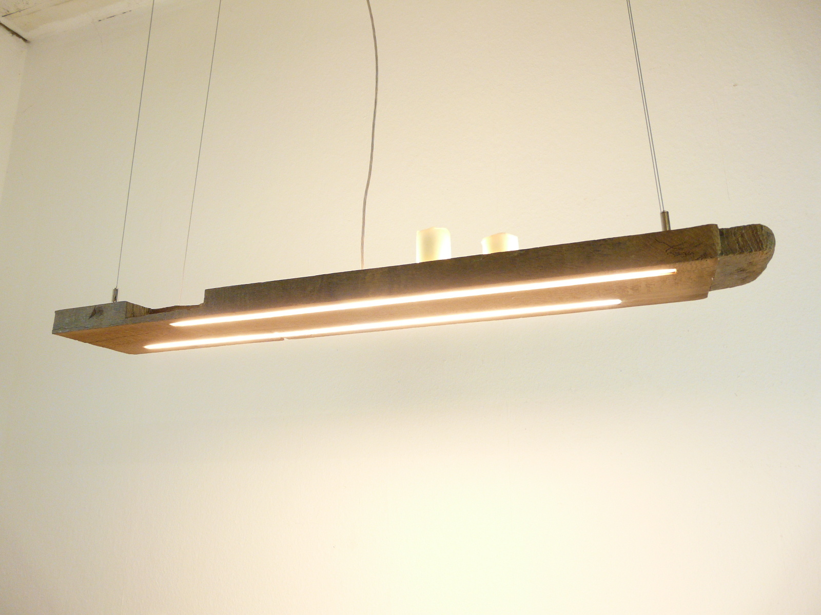 Ein mehrere hundert Jahre alter Holzbalken wurde zu einer wunderschönen Lampe in Handarbeit gefertigt.