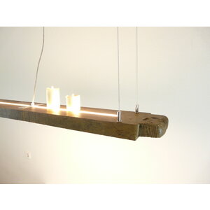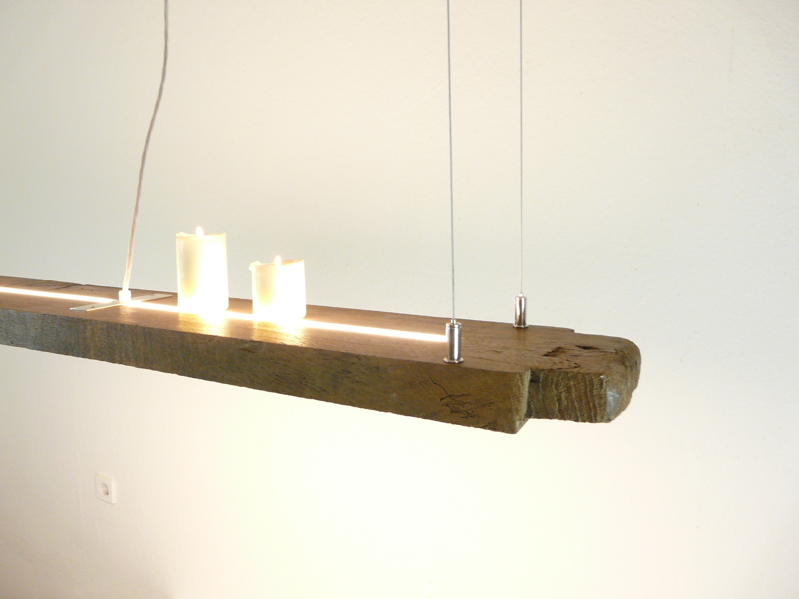 Die Holzoberfläche des Eichenbalkens wurde naturbelassen und dadurch zeigt sich gerade die antike Maserung des Eichenholzes. Durch die hauchdünnen Drahtseilabhängungen scheint die Leuchte förmlich im Raum zu schweben.