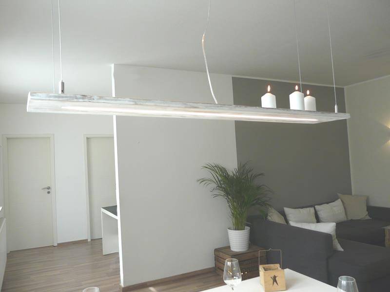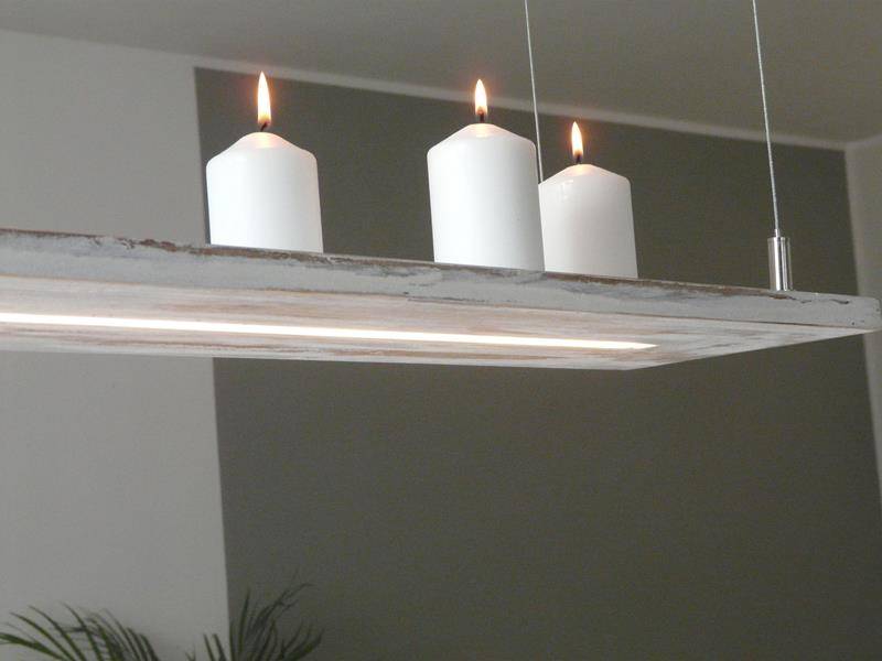 Shabby Chic und moderne LED Technik in Einklang gebracht! Die LED Bänder wurden mit einer opalen Abdeckung zur optimalen Lichtverteilung abgedeckt. Die Hochleistungsleds ergeben ein hervorragendes gleichmäßiges und blendfreies Licht auf dem Tisch. Durch die 4 hauchdünnen 150 cm langen Drahtseilabhängungen scheint die Leuchte förmlich im Raum zu schweben.