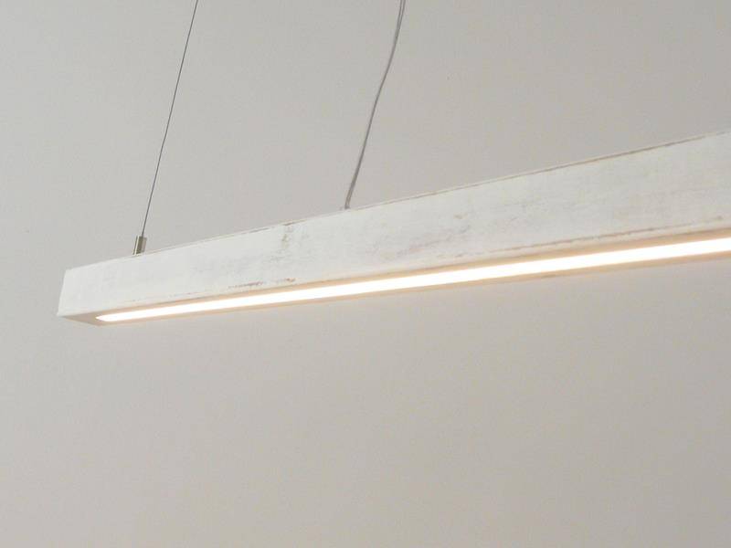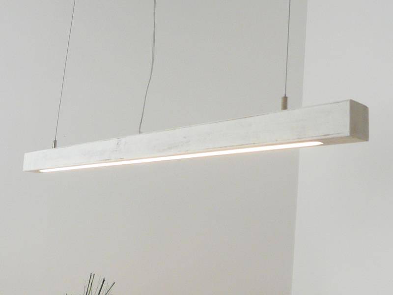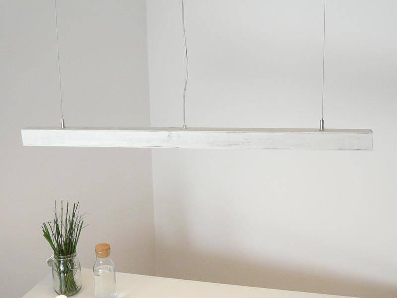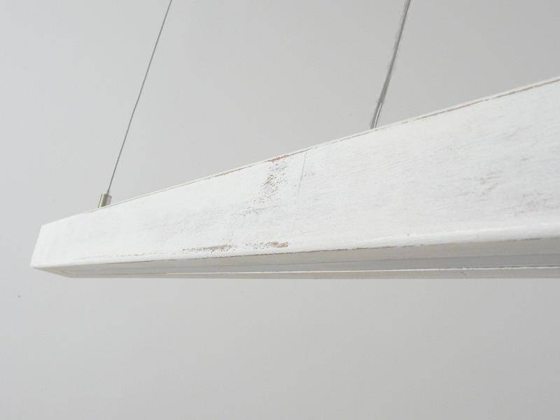 Schlicht, elegant, modern und zeitlos ist die aus einem massiven und geleimten Vierkantholz gefertigte und dann in shabby-chic weiß gewachste Pendelleuchte. Mit den 2 hauchdünnen Drahtseilabhängungen scheint die Leuchte förmlich im Raum zu schweben, die Zuleitung wird mittig herausgeführt. Das weiße Trafogehäuse schließt die Leuchte zur Decke hin ab.