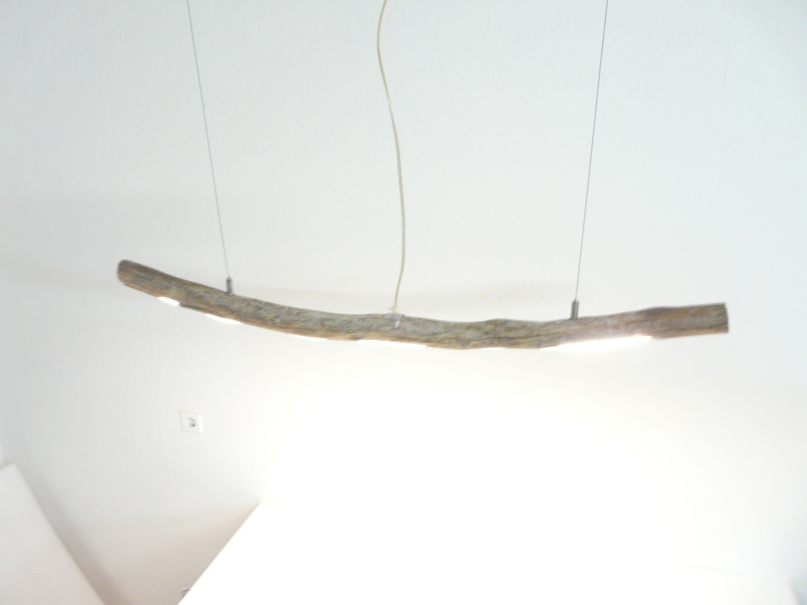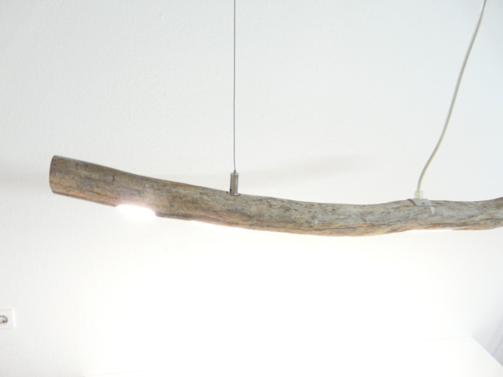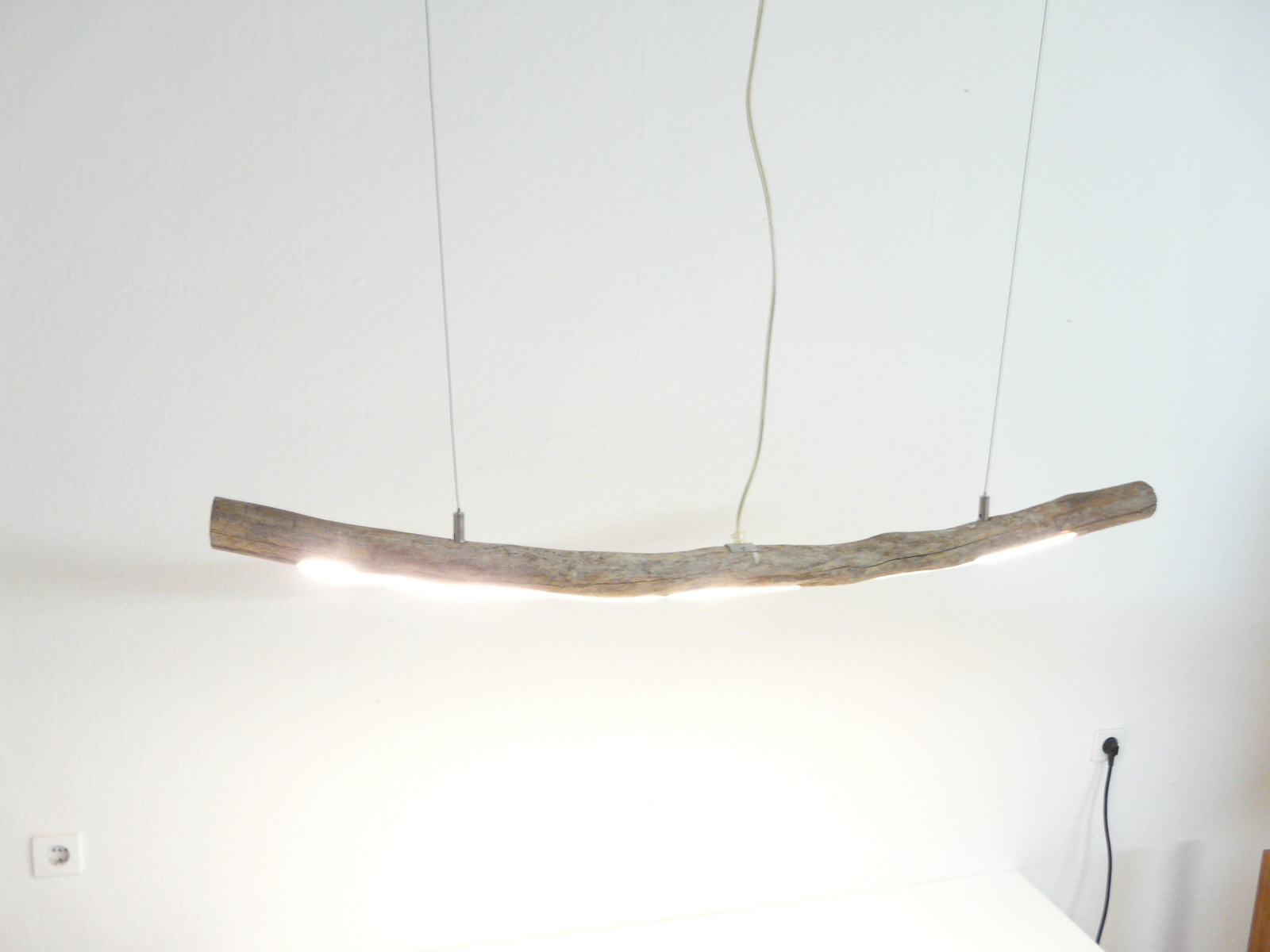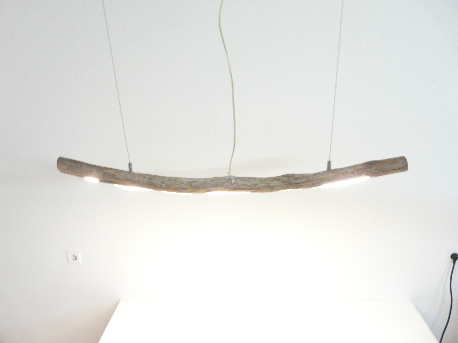 Jede dieser Treibholzleuchten ist ein einzigartiges Stück Natur. Dem Treibholz angepasst wurden die LED Bänder mit einer opalen Abdeckung zur optimalen Lichtverteilung abgedeckt. Durch die 2 hauchdünnen 150 cm langen Drahtseilabhängungen scheint die Leuchte förmlich im Raum zu schweben.Die Zuleitung mit dem Netzteil wurde mittig der Leuchte herausgeführt. Die Holzoberfläche wurde naturbelassen.